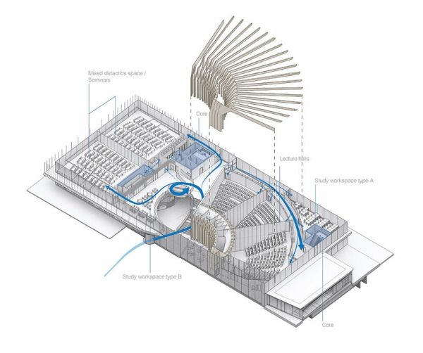 該建筑占地8844平方米,由教學空間組成,包括演講室、教室和各種學習空間,可容納約1700名學生。大多數空間提供了靈活的布局。例如,位于一樓的最大的演講室可以容納700人,在不到20分鐘的時間內可以輕松地分成三個獨立的房間。這促進了多個講座或活動的同時進行,并實現了空間的最大規劃。各種教學室都是根據講師和學生當前和未來的需要而設計的。