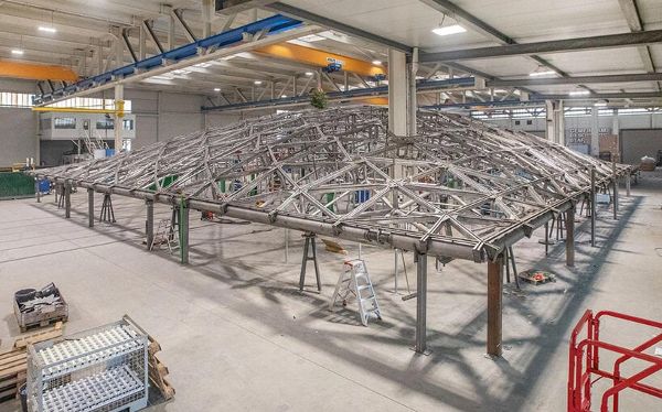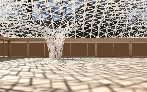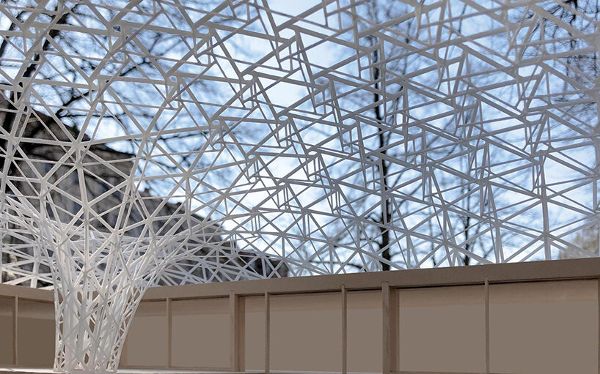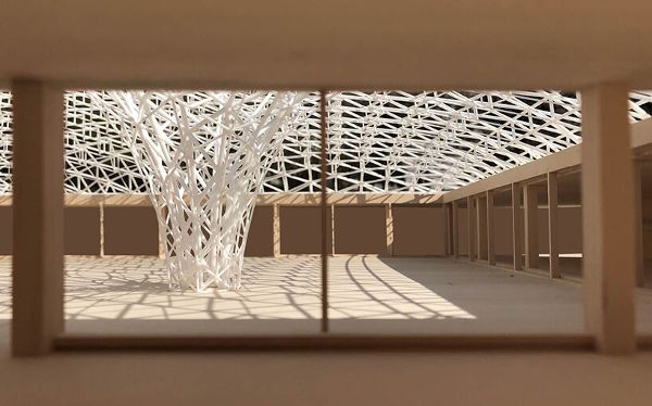 天篷的幾何形狀在庭院中描繪出一條經過深思熟慮的軌跡,從屋頂邊緣的三角形圖案過渡到中心的六邊形圖案。屋頂結構具有交替的鏡面,可反射陽光,最大限度地減少熱量增益,以實現環境的可持續發展。六邊形和三角形的分布平衡了屋頂的打開和關閉,盡管近一半的表面是封閉的,但仍創造了一個開放且通風的空間。由一個偏離中心的點支撐,結構獨特的漏斗狀柱子象征著對曾經的山楂樹的紀念,消除了對新支撐系統的需求。這一特點增加了運動,并吸引了雨、雪、樹葉和光線等自然元素。