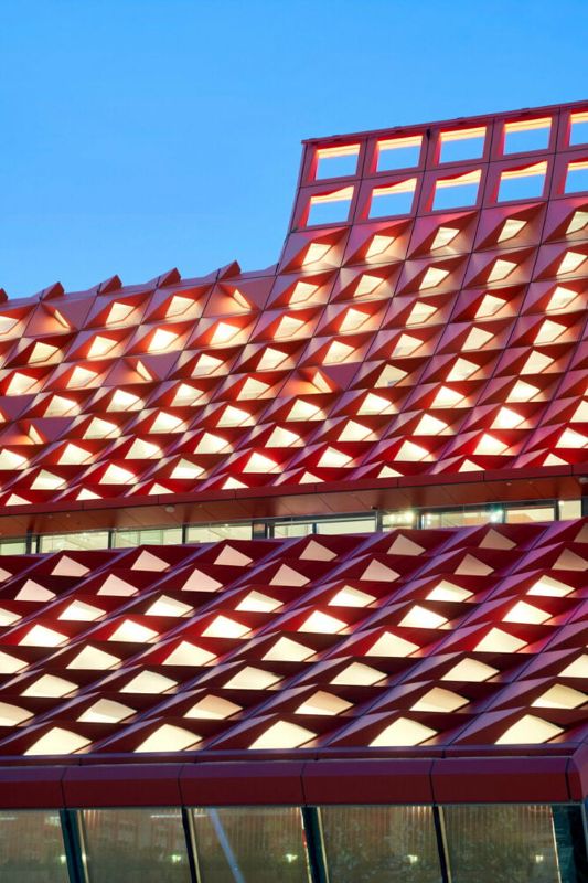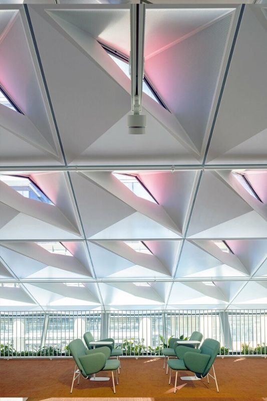 建筑的斜面設計兼具功能性和美觀性。它促進了自然通風,讓空氣向尖頂上升,而尖頂則像煙囪一樣抽走熱氣和污濁空氣,從而減少了對空調的需求。可操作的百葉窗進一步加強了通風效果,營造出舒適和可持續發展的室內環境。屋頂的三角形受到太陽軌跡的影響,形成了一種動態的色彩交織,就像伸手可及的云朵。從當地的植物中汲取靈感,所選用的紅色在周圍的綠色和灰色塔樓中顯得格外醒目。