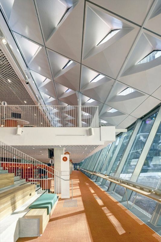 往上走,設計過渡到更安靜的環境,提供更小、更私密的空間,適合個人工作或小團體活動。這樣的安排為整座建筑營造了不同的氛圍,從底層的熱鬧非凡到高層的寧靜保密。