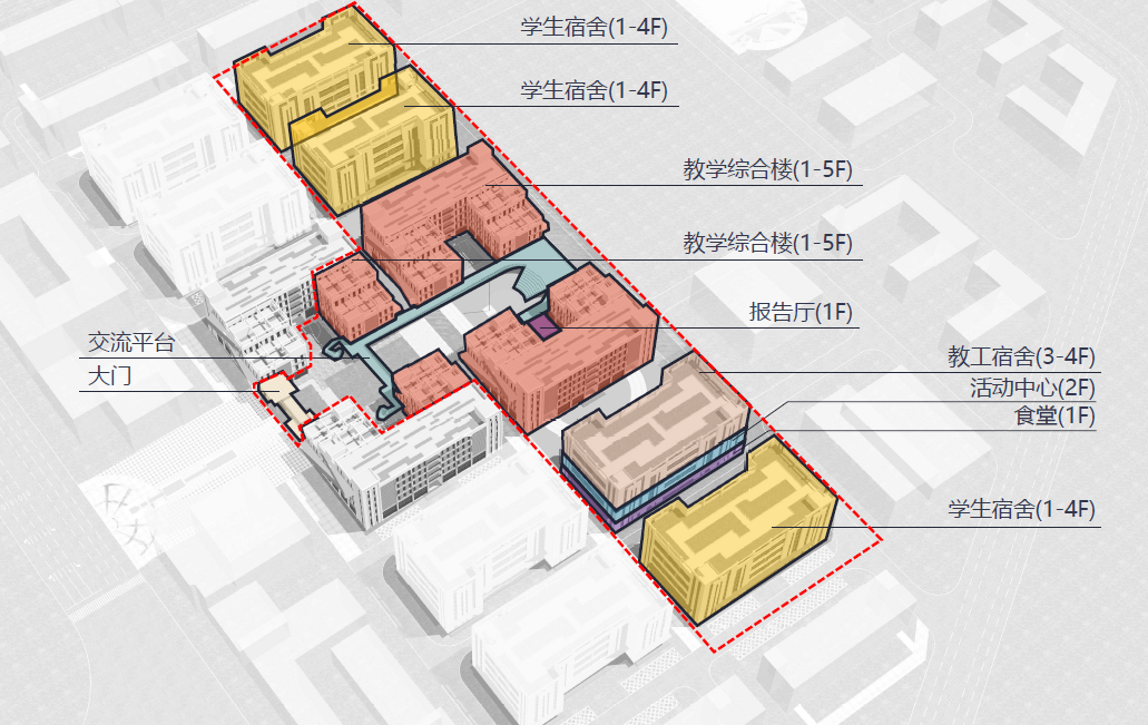 First ,according to the teaching demand and the principle of dynamic and dynamic zoning, we make each function in its proper place. After the completion of the project transformation, it is planned to set up teaching complex building, communication platform, lecture hall, activity center, canteen, dormitory and other functions.