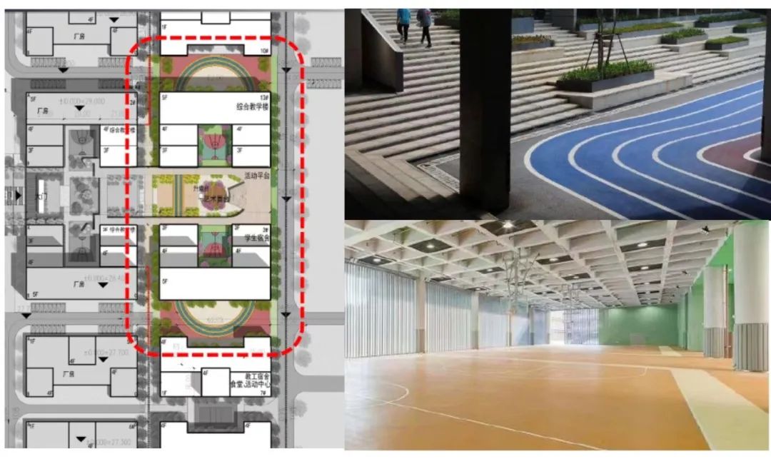 方案實現了空間多元,功能靈活的設計目標,讓整個園區成為了課堂,開闊了項目格局。設計結合現狀建筑柱網,將底部改為架空層,設置300m跑道以及其他運動空間。