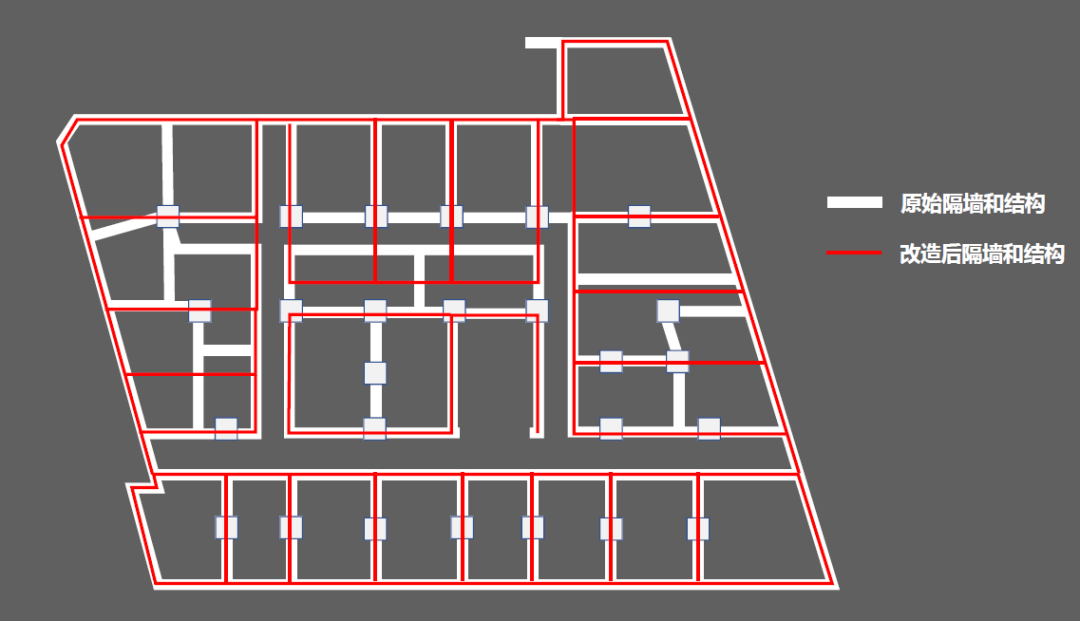 方案設計的首要原則就是要充分尊重結構現狀,減少拆改。這里不光是改造成本因素的考量,更是要以保護的初心去進行設計,不能讓已遍體鱗傷的歷史建筑再傷筋動骨。