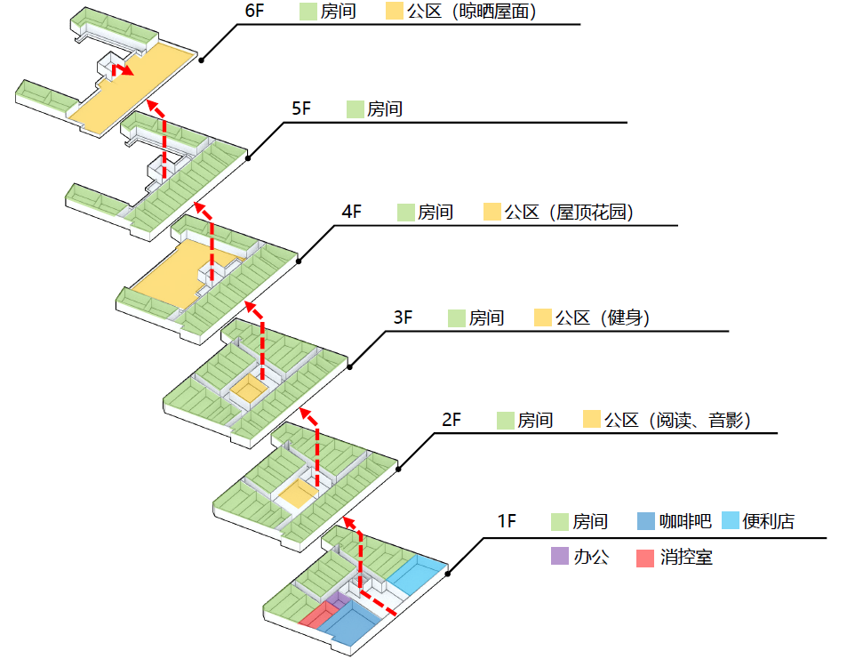 方案前期在對既有長租公寓市場進行了研究分析基礎上,從客群、對標案例以及不同品質長租公寓案例研究等諸多因素進行初步定位。提出打造輕奢品質的一站式服務“馨居所”。功能涵蓋共享大堂、便利店、書吧等六項配套功能。