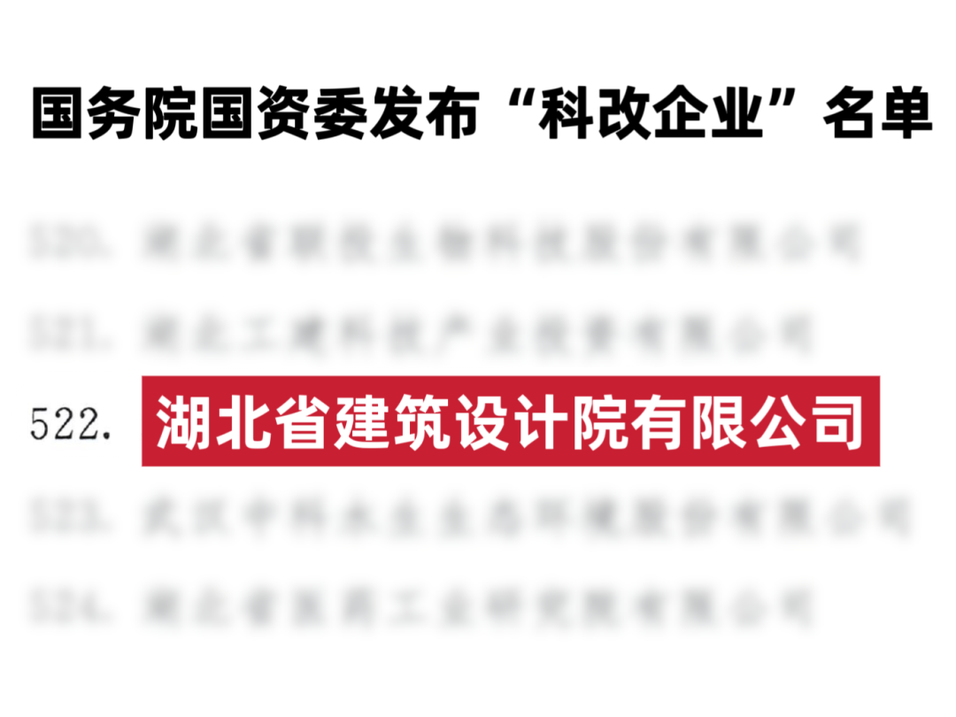 日前,國務院國資委發布最新“科改企業” 名單,湖北省建筑設計院有限公司入選。