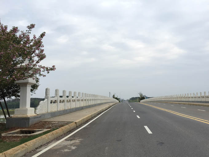 梓山湖大橋橫跨梓山湖,是賀勝新城道路交通網絡的重要組成部分,也是一個集交通、景觀、泄洪為一體的綜合項目。橋梁上部結構為13孔連拱橋,橋墩為板式墩接承臺;橋梁兩側采用路堤與橋梁相接;橋梁長163.36米,寬21米。