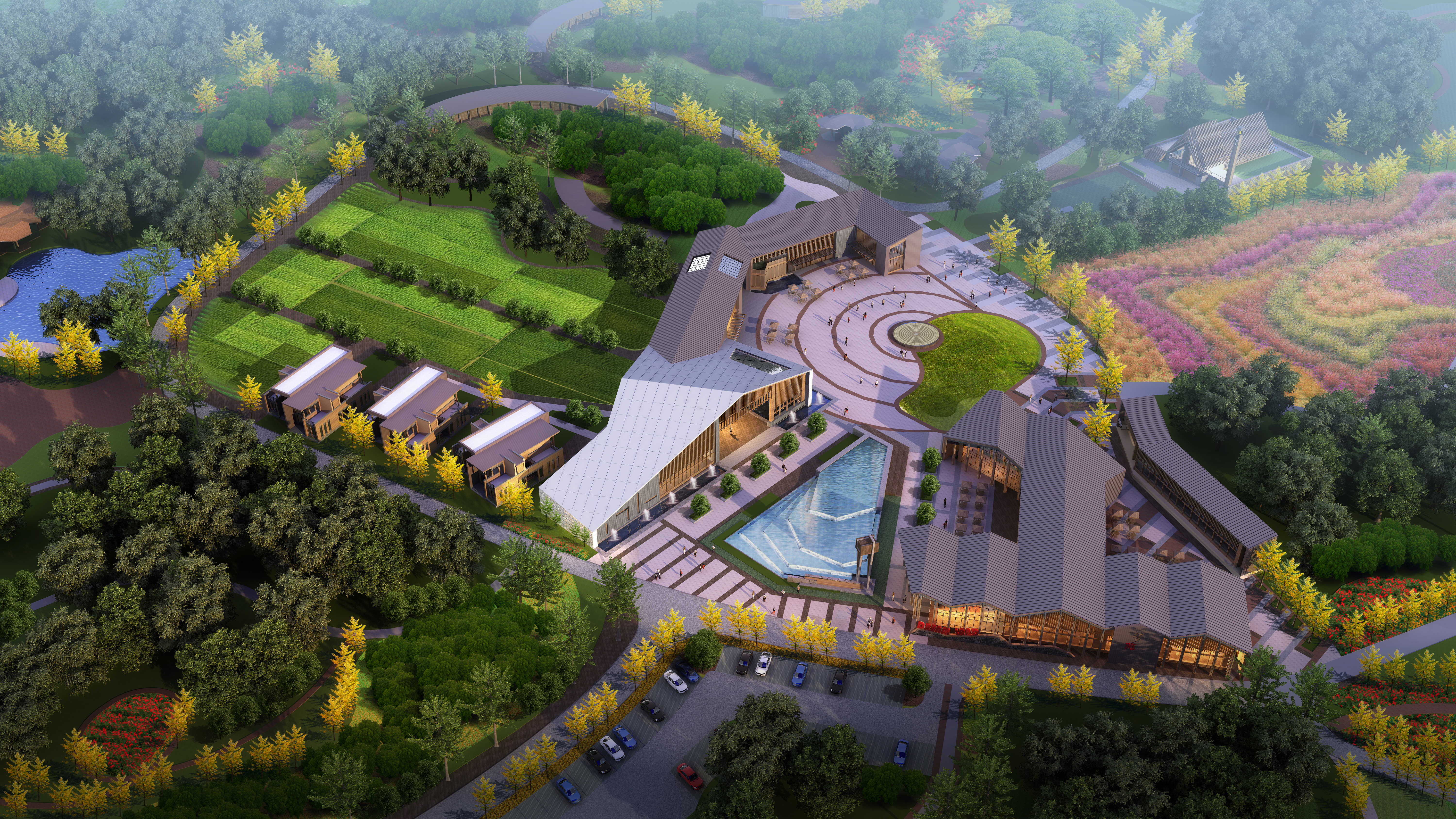 本項目位于宜昌市夷陵區,總建筑面積約27300平方米,由一組不同功能的單體建筑組成。設計中,我們結合園中各單體建筑各自功能和場地特征,竭力打造既能有機統一,又能凸顯各自特色的建筑群落。 整個規劃設計我們始終遵循“自然和諧”的設計原則,充分利用項目現有的自然資源,結合場地特點去處理各個建筑功能間的關系和布局,力求最小化項目開發對原有自然環境的破壞。 建筑設計上我們力求融入而又不缺創意。整個建筑風格既有山林建筑的特有元素,又有現代感的玻璃金屬元素;兩者相融合的處理手法,營造一個多元場景空間,讓人能更好融入和享受游玩的樂趣。