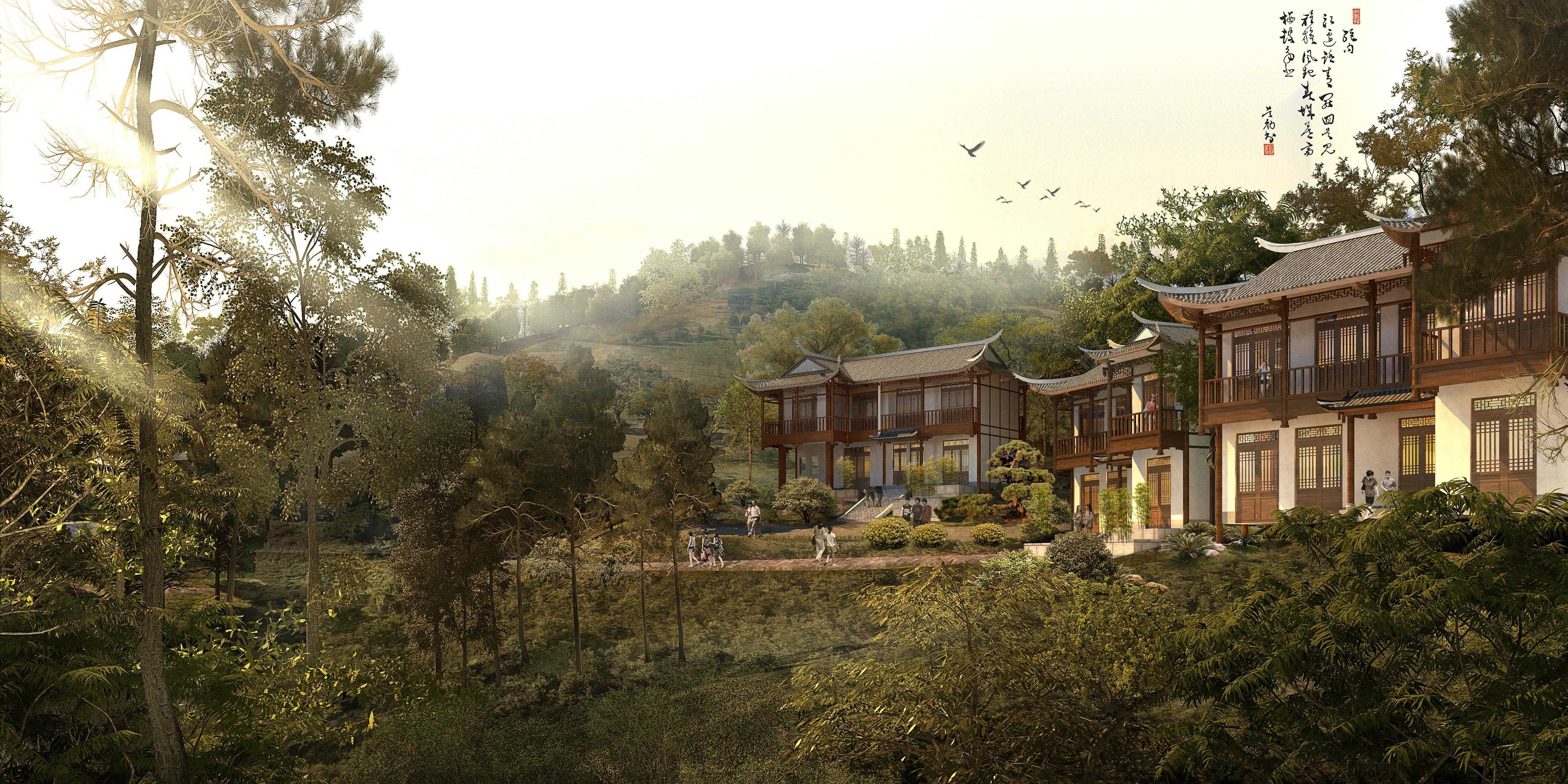 本項目規劃用地面積338857㎡,總建筑面積14810.71㎡。本項目規劃建設用地位于柑子坪村,分為地塊一和地塊二兩個地塊。兩個地塊各有一部分土地與龍馬集鎮規劃用地重疊。 柑子坪村與龍馬集鎮新興熱點土苗風情街隔河相望。用地西南連接龍馬大橋與雙龍公路,地塊南部的鄉道將整個地塊和周邊緊密聯系起來。本項目定位是“隱居硒都茶山;養生龍馬田園”,設置山林養生區、茶園客棧區和田園療養區三個片區,運用具有土家傳統建筑特色的設計,打造別墅、公寓、療養中心、綜合服務設施等建筑,創造恩施州康養旅游的新標桿。