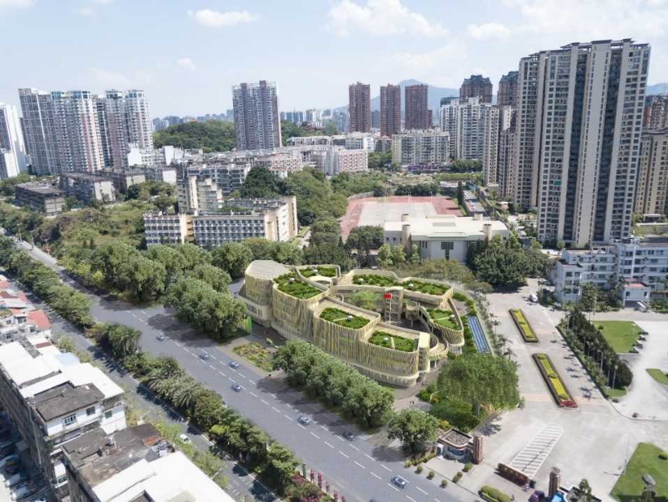 項目位于福建省莆田市城廂區核心區域,東北側緊鄰東圳西路,西側和南側緊鄰莆田學院(北區)。本項目用地面積為10045平方米,規劃建筑面積為17011平方米。設計時考慮用地效率的最大化,讓建筑與榕樹自然融合,從而衍?出設計主題“萬向??”,塑造出貼合幼兒教育活潑生動的建筑空間。目前該項目建設中。